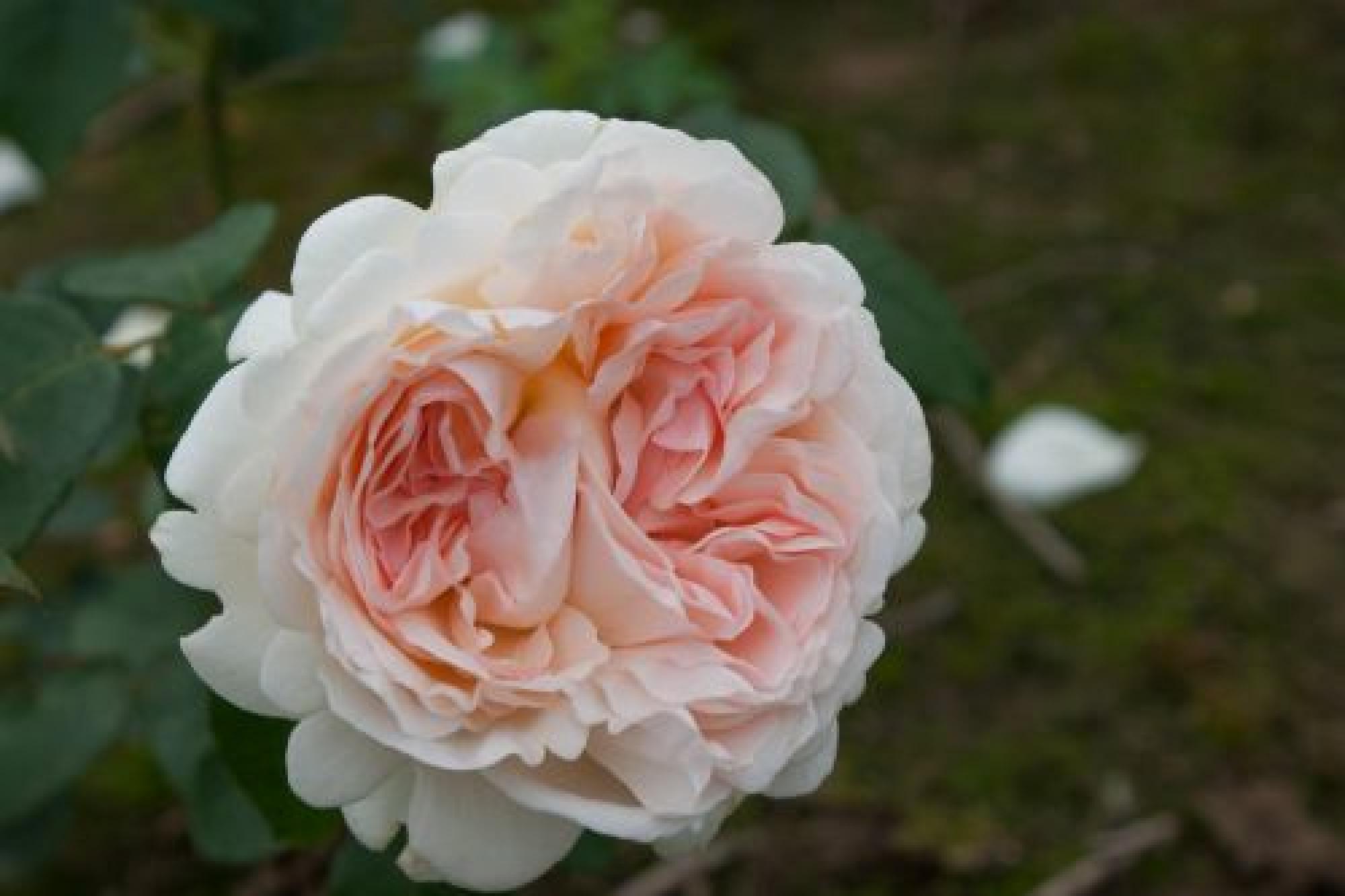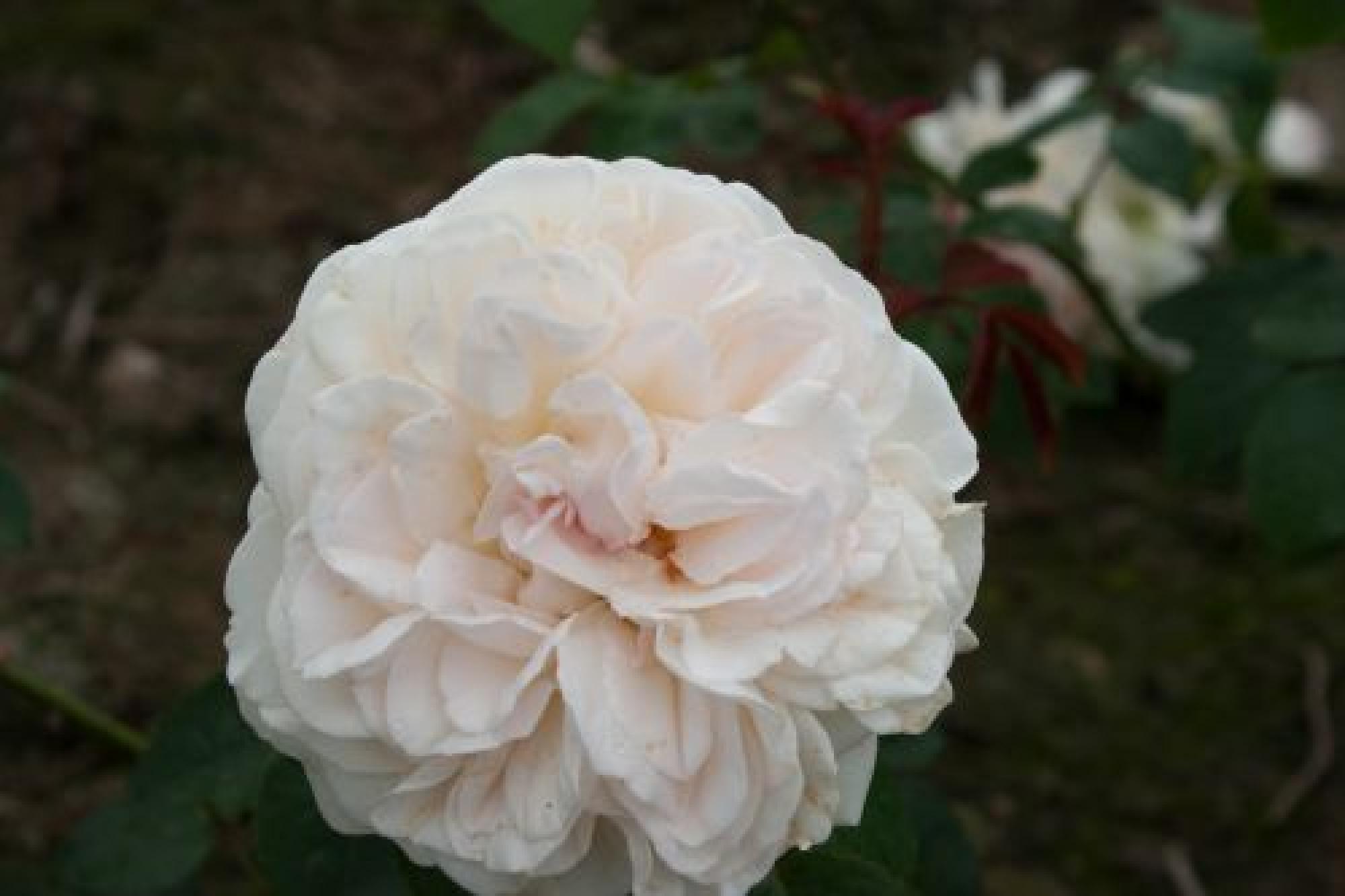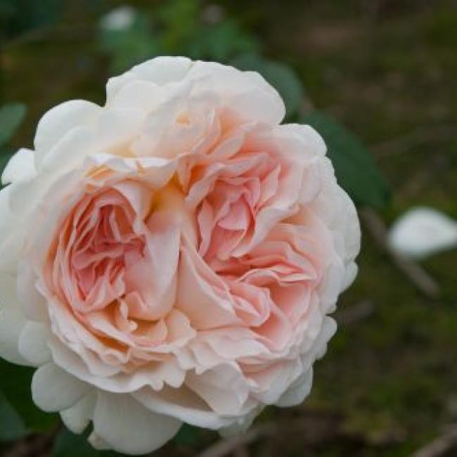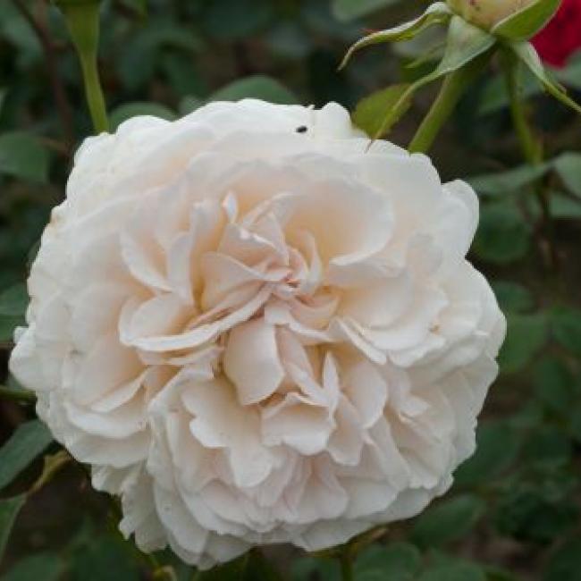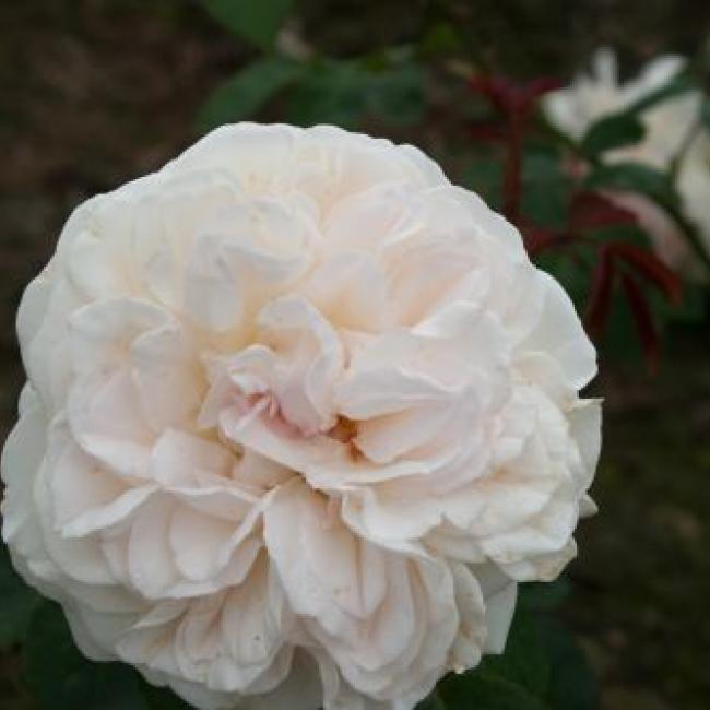 Een dicht gevulde crème-witte bloem, naar het midden overlopend in een geelachtige roze kleur, met het uitgesproken karakter van een klassieke roos. De sterk geurende bloemen vormen een mooi contrast met het donkergroene blad. Roos met een sterke zoetige geur.