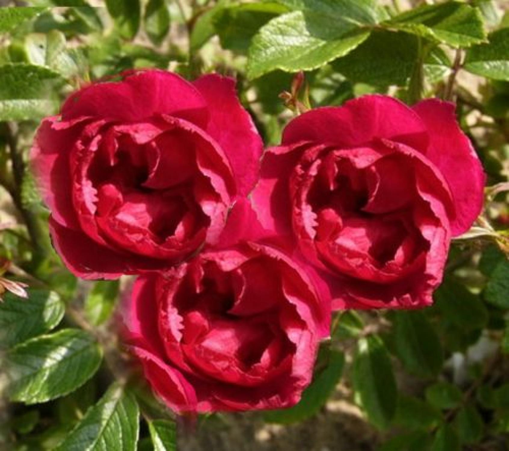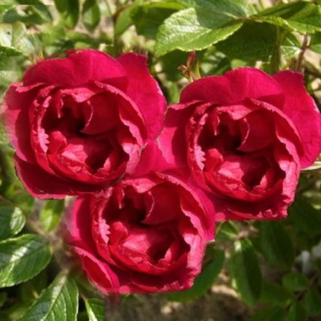 Kleine donker rode bloemen die in trossen aan de stelen staan. De bloemetjes zijn klein en de bloemranden zijn gekarteld. Net anjertjes. De stelen zijn zwaar gedoornd. Het is een sterke en gezonde roos.