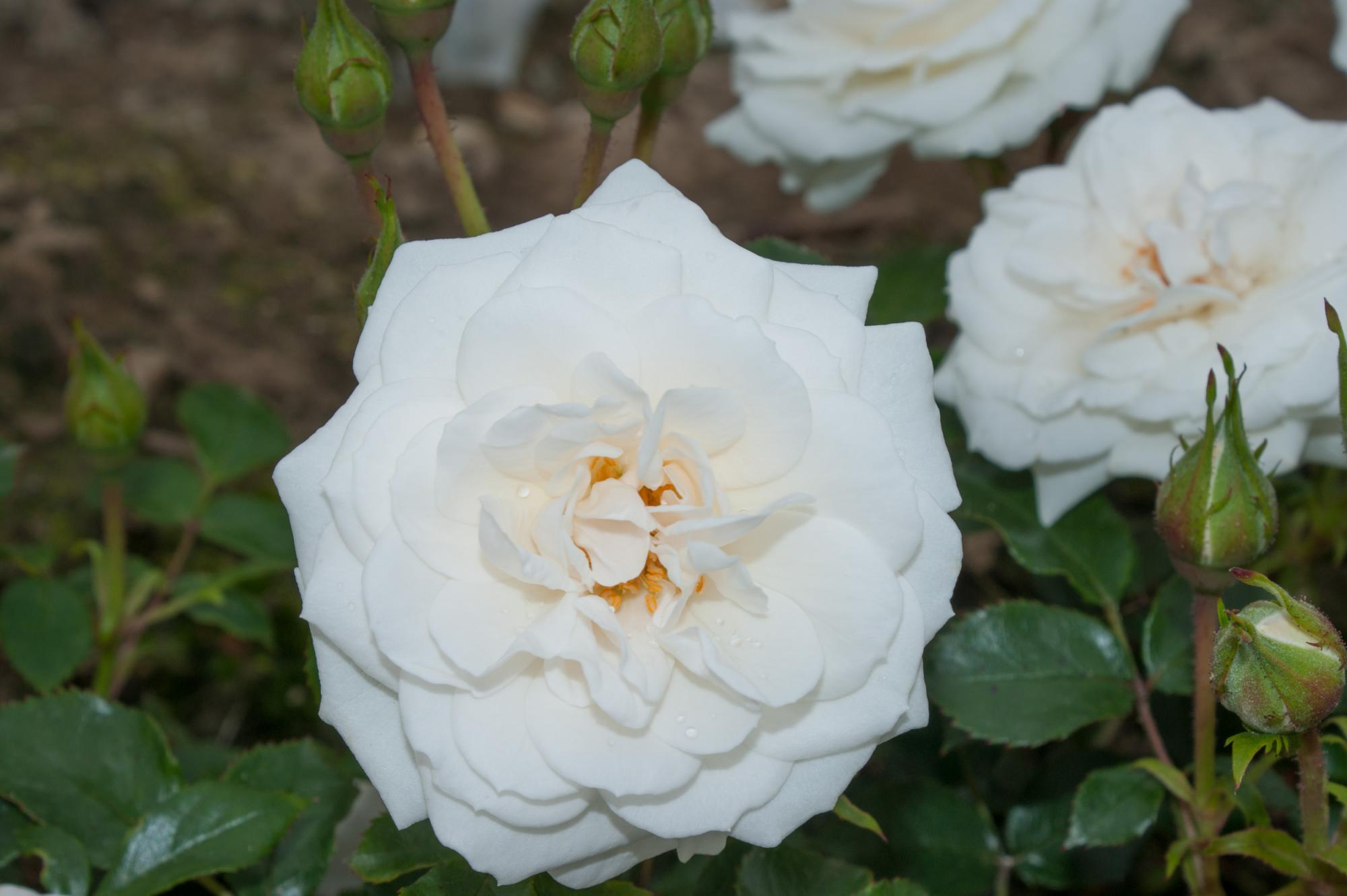 Aan deze laag blijvende, bossige roos komen trosjes kleine gevulde roosjes. De bloemen zijn goed gevuld en wit met een tintje roze van kleur. Deze dankbare bloeier is kort en compact en hiermee geschikt als potroosje.