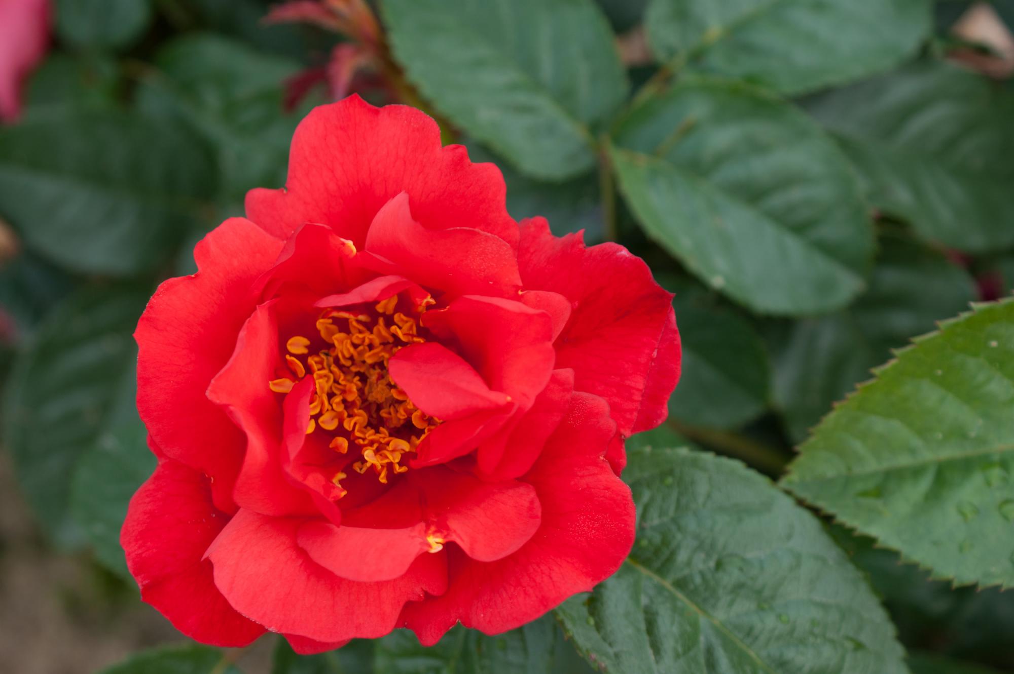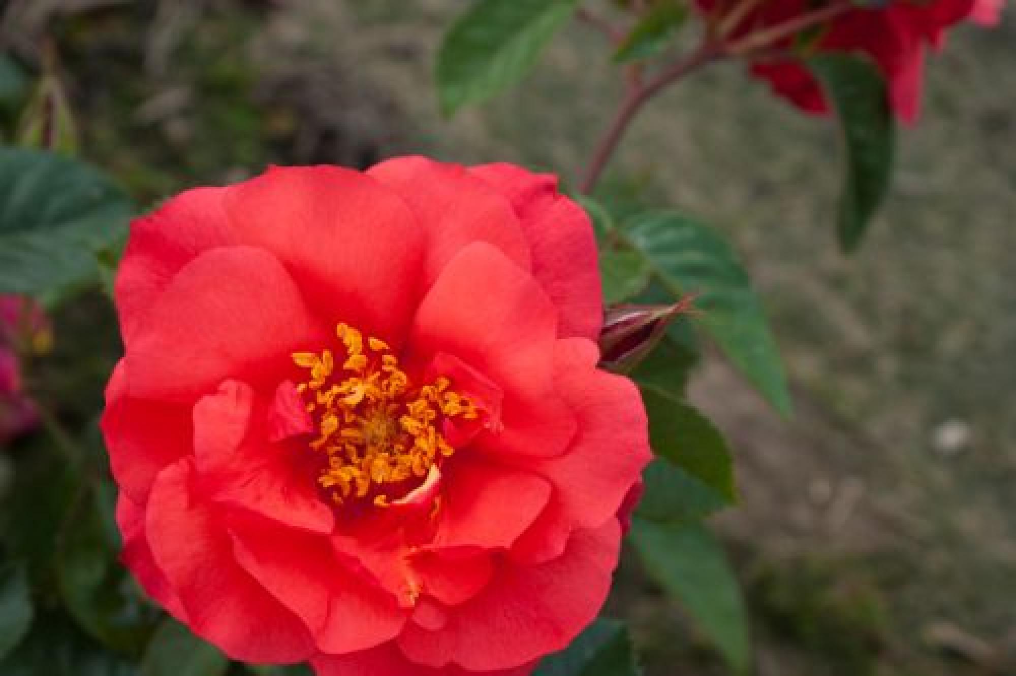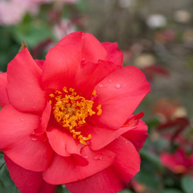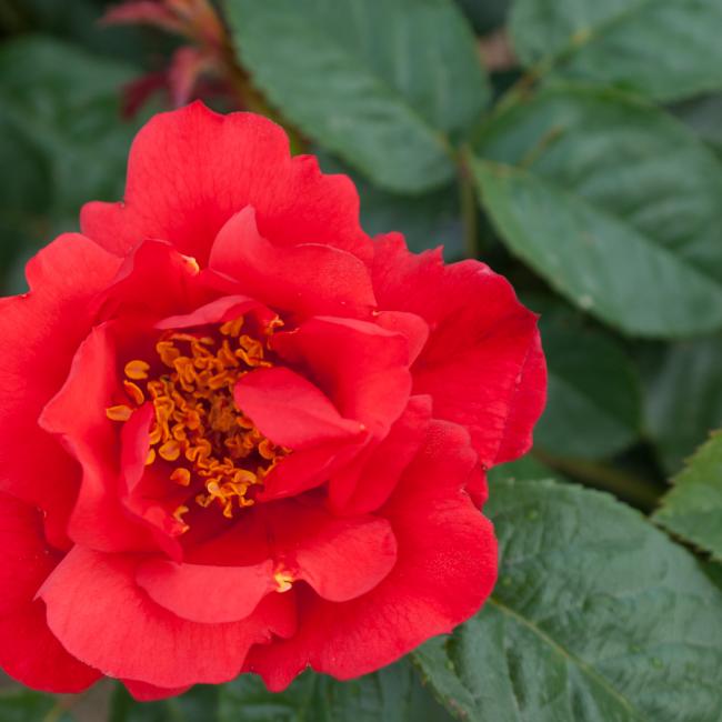 Grote enkelvoudige oranje of oranje rode bloemen schitteren aan deze heesterroos. De bloemen lijken wel van papier, prachtig! De gele meeldraden zijn goed zichtbaar. Deze roos heeft donkergroen en zeer gezond blad. Een absolute aanrader!