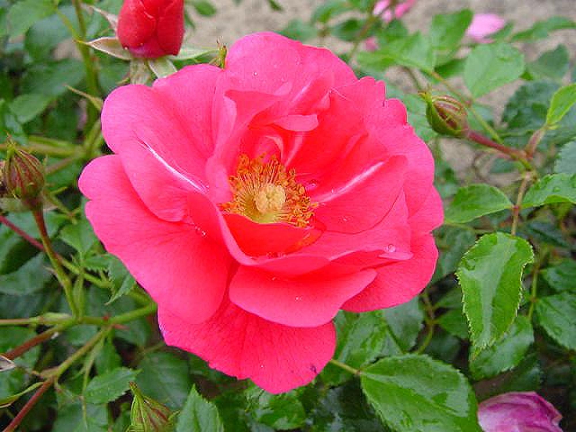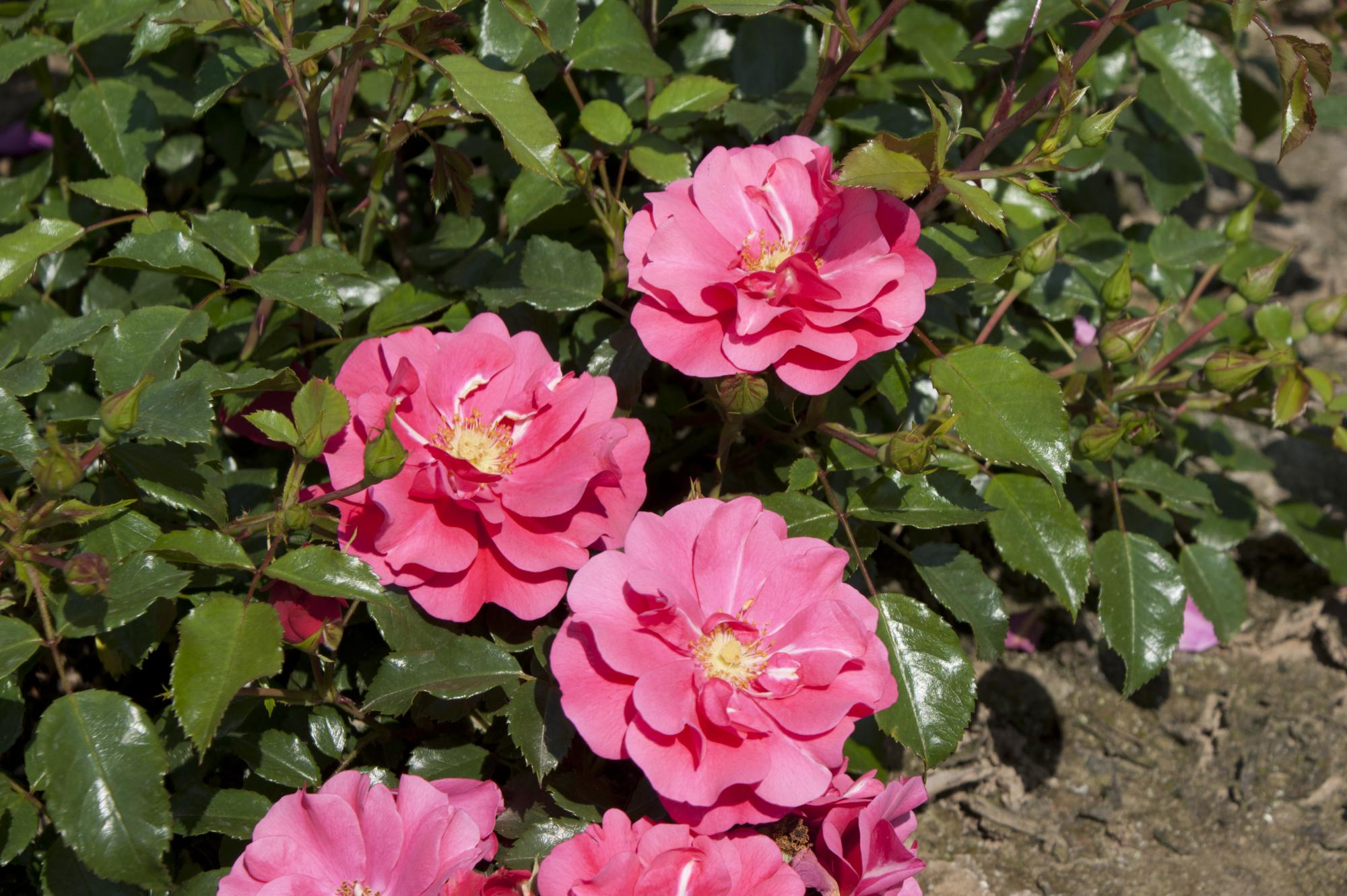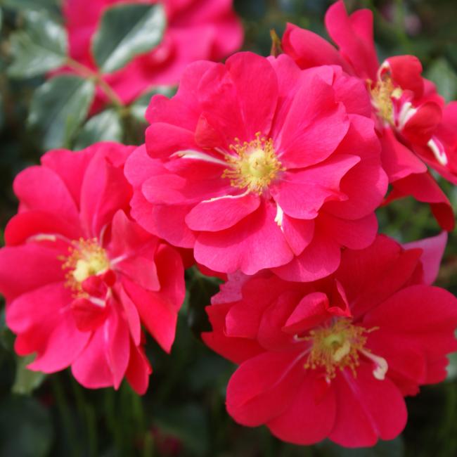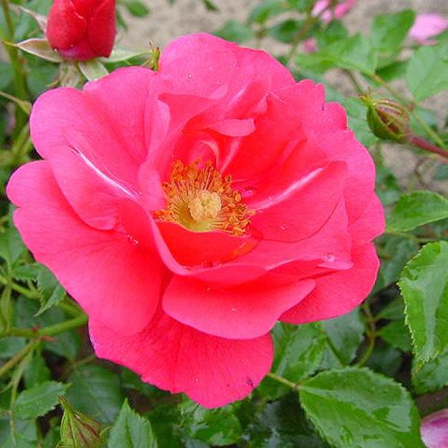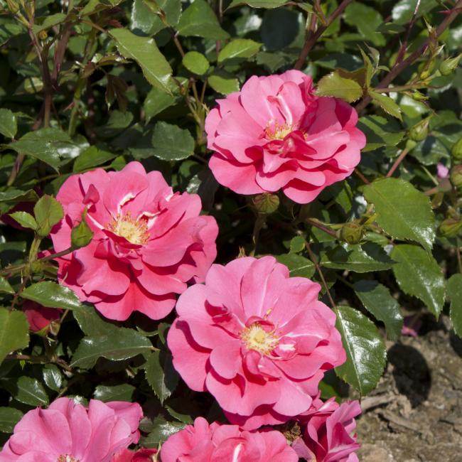 Roze, licht gevulde roos. De bloemen vouwen zich helemaal open, en de meeldraden zijn zichtbaar. Mooi glanzend, donkergroen blad. Super gezonde roos!
