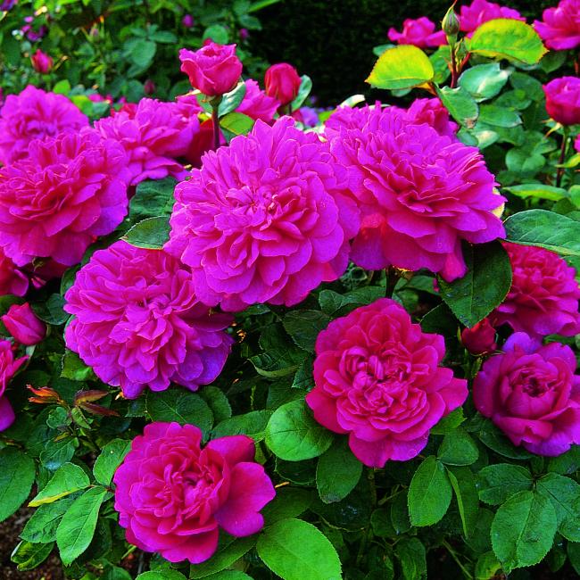 Rode tot purper rode rozen, met dikke rozetten. Dik gevuld en geurend naar thee.