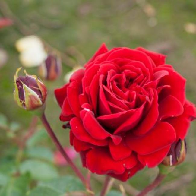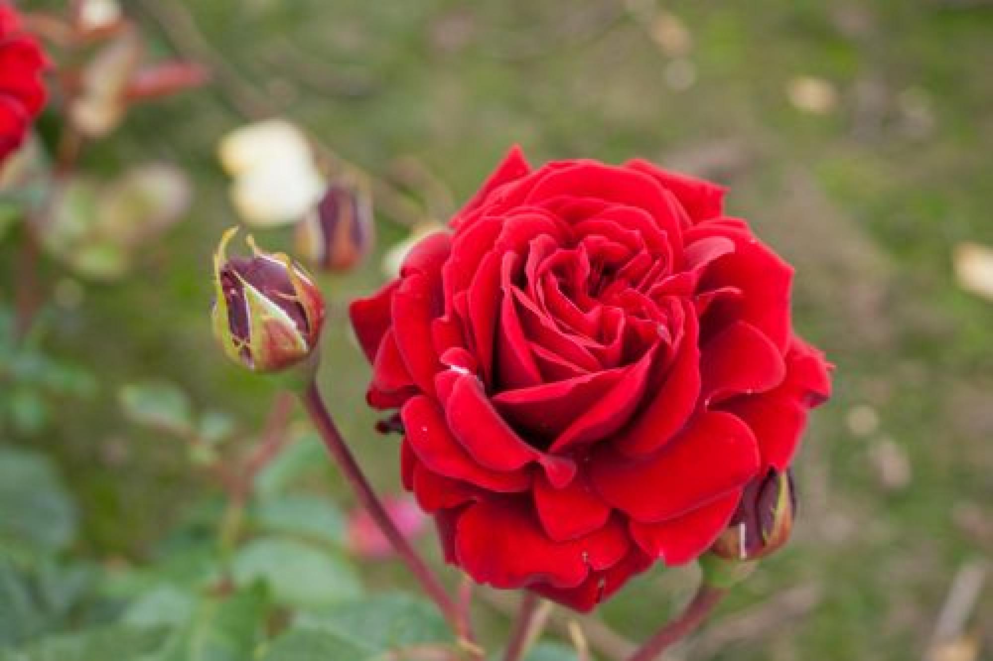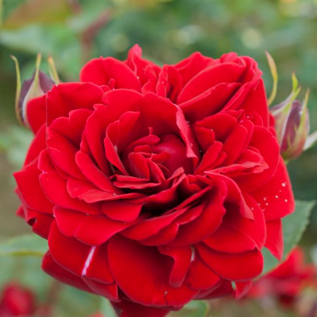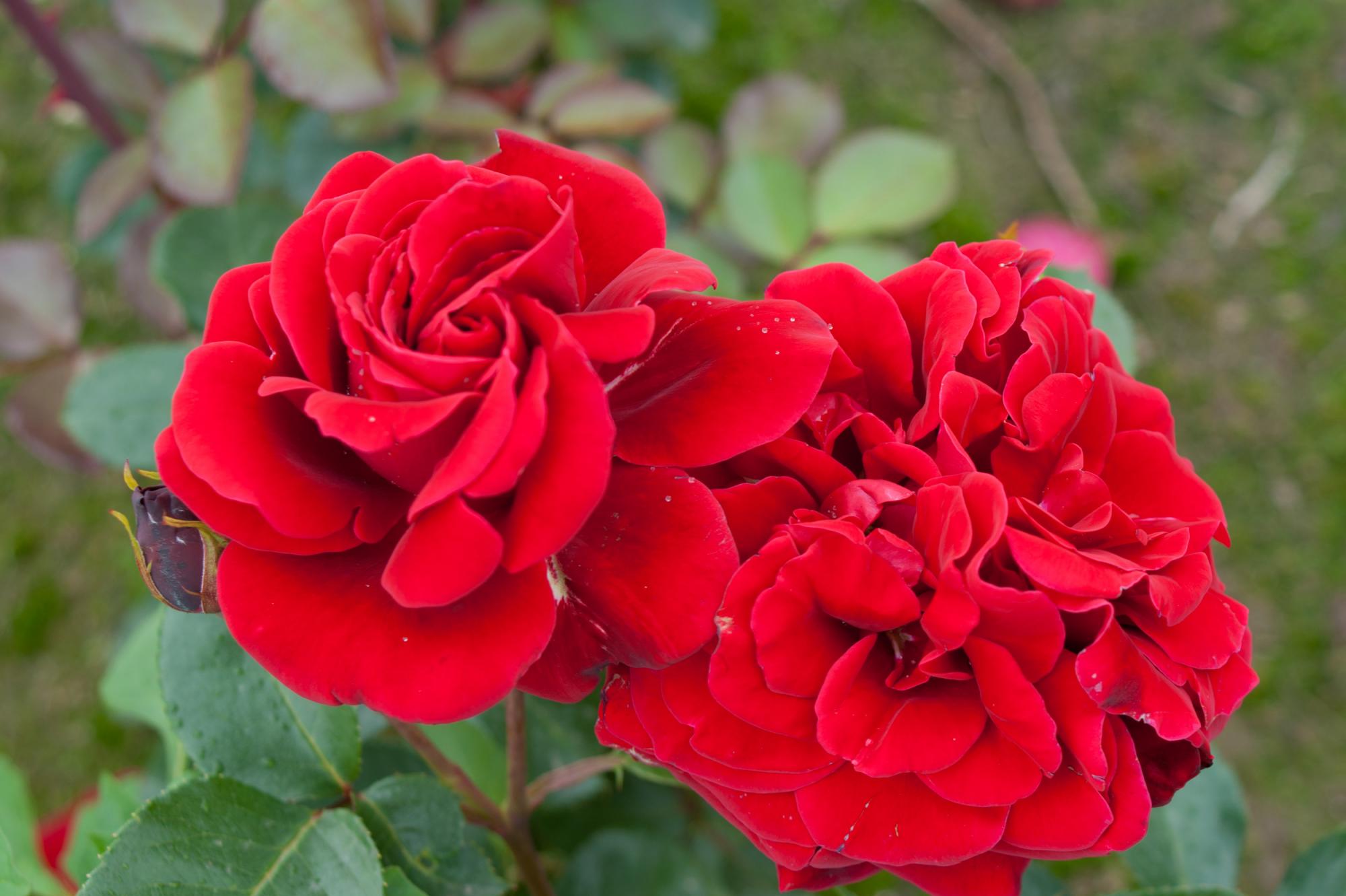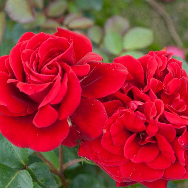 Zeer grote, gevulde, diep donkerrode bloemen en geurend, glanzend donker blad sieren deze doorbloeiende, gezonde roos.