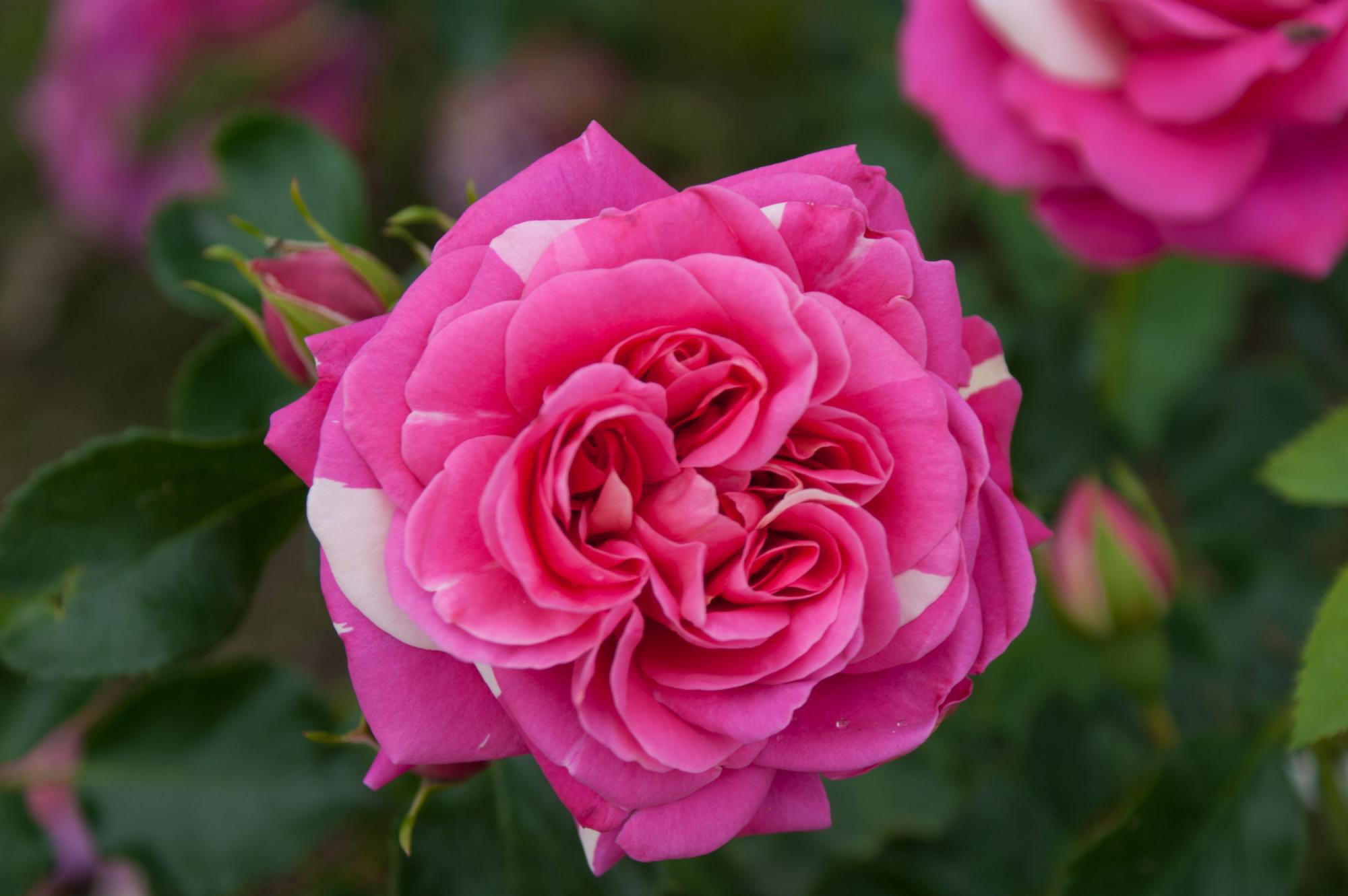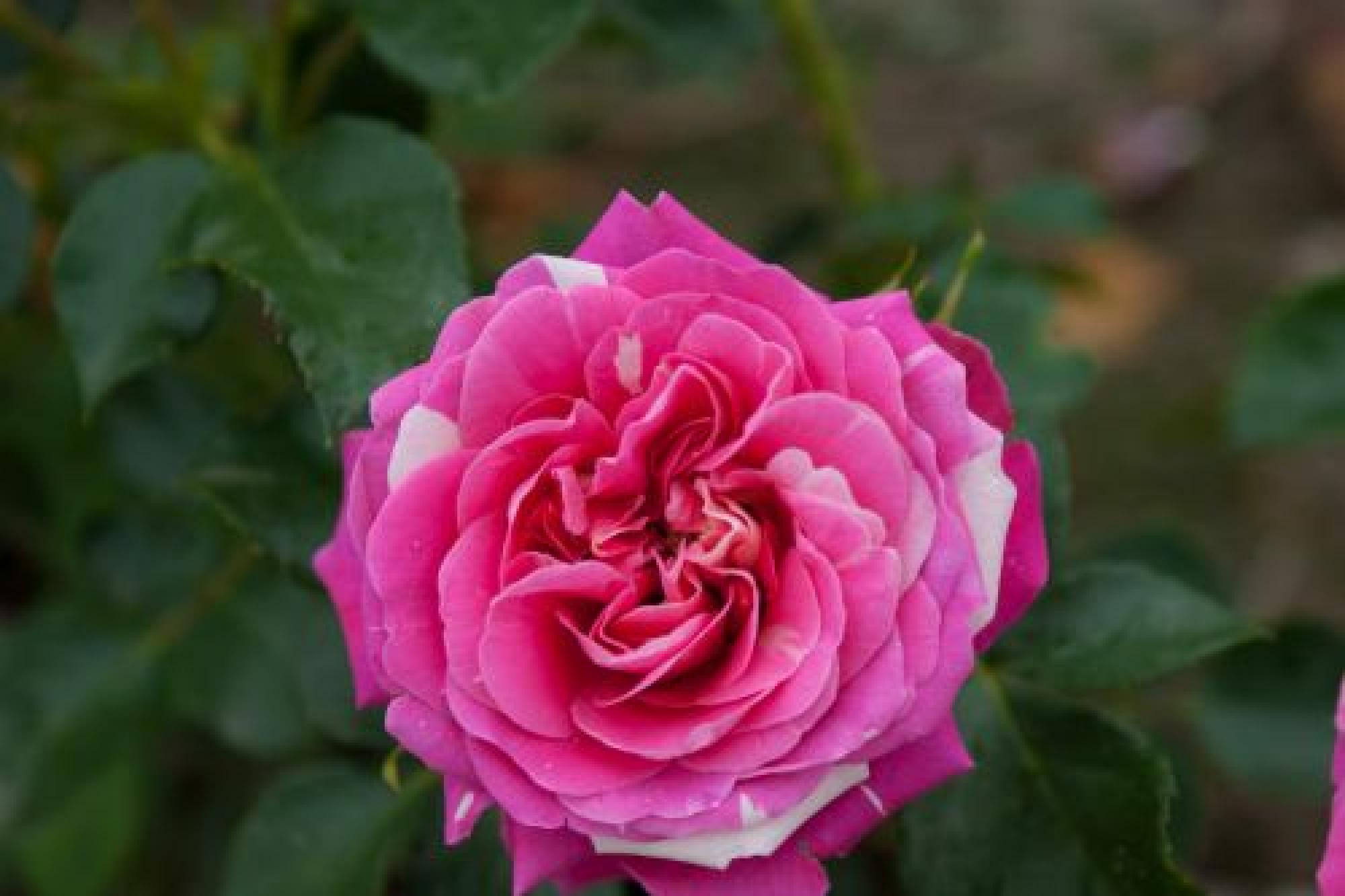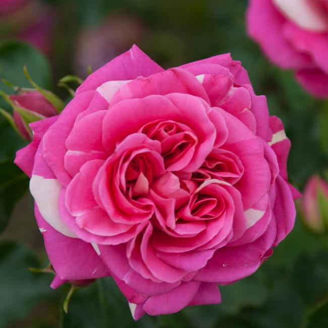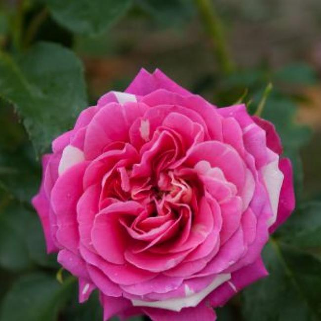 Een robuuste Floribunda perkroos met goede gevulde oud roze bloemen met gedraaide bloembaadjes.