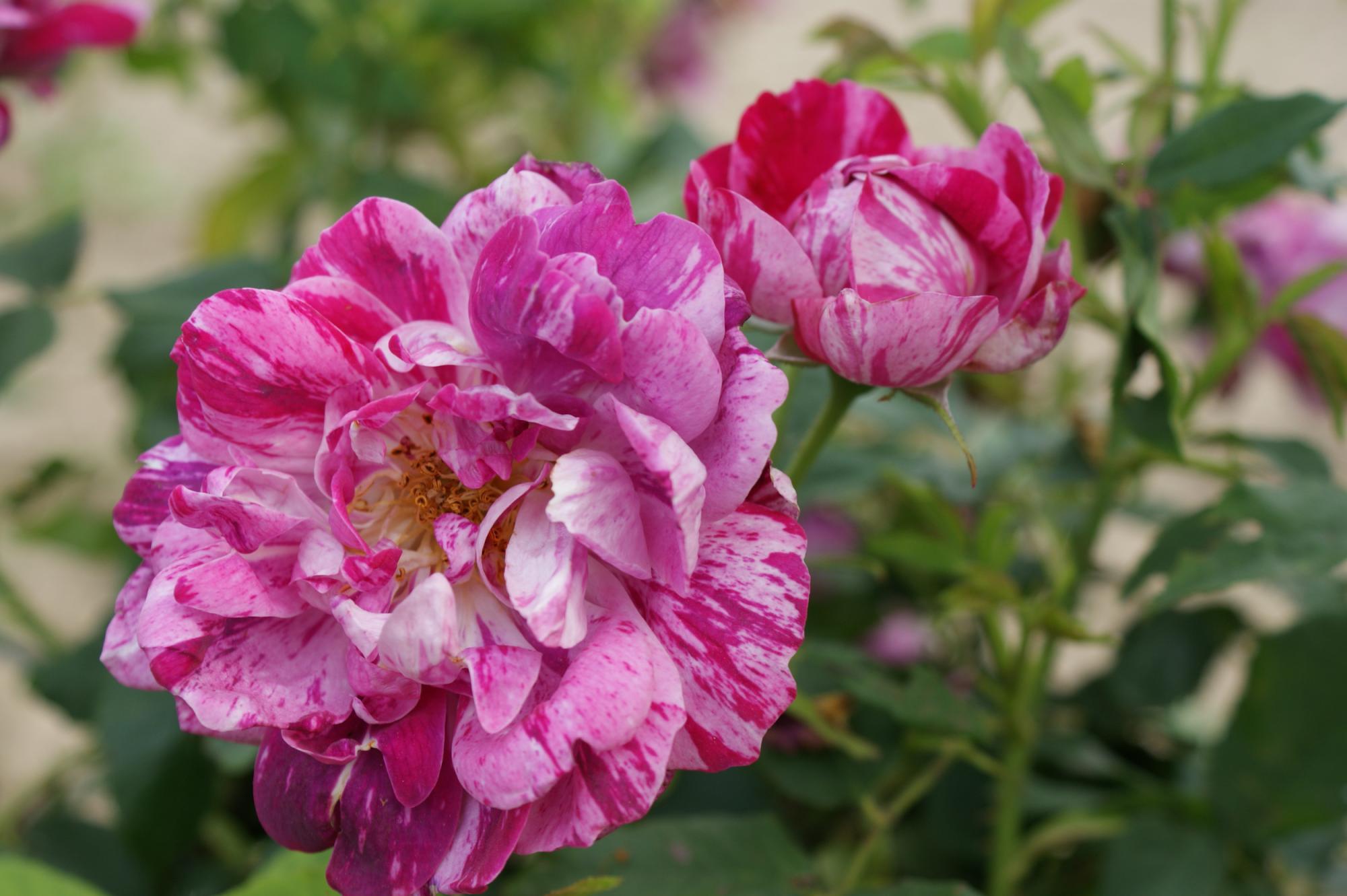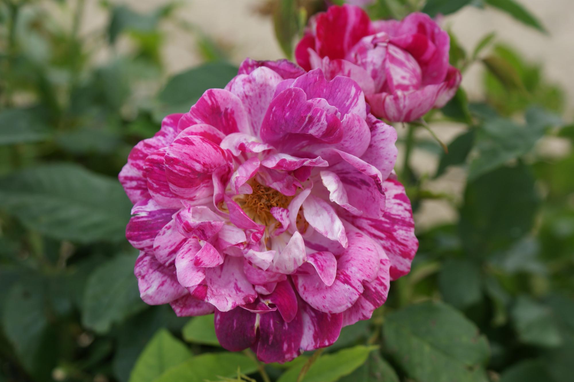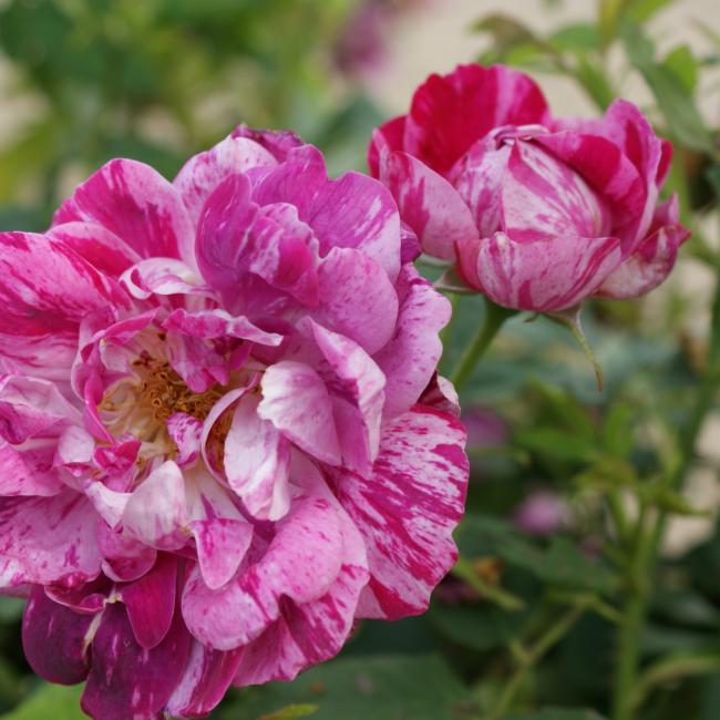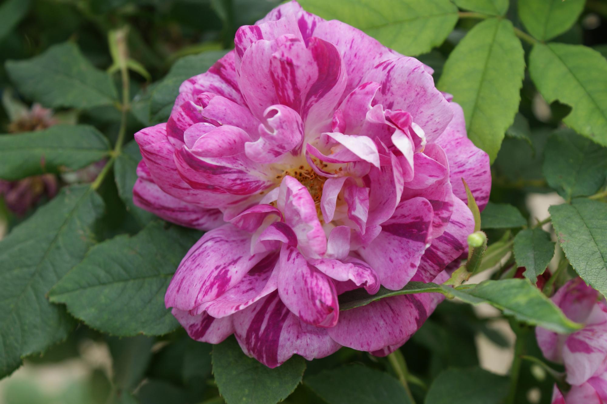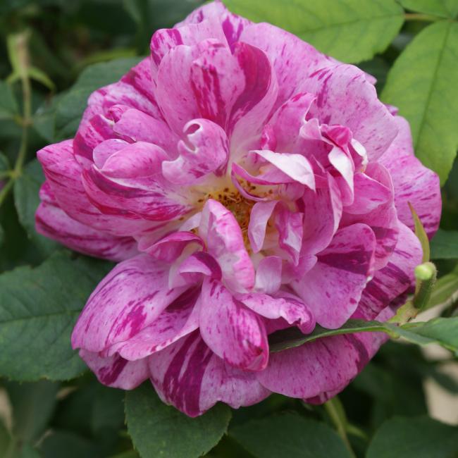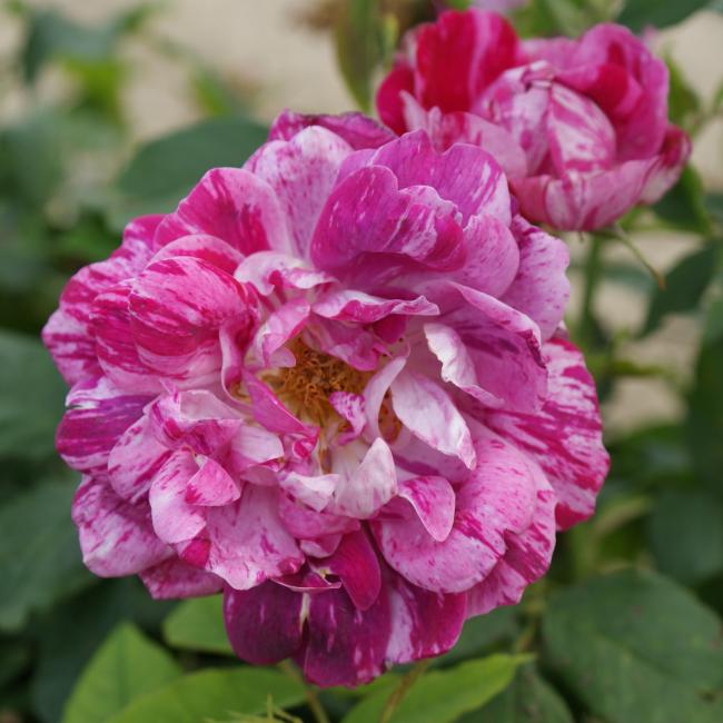 Deze roos heeft witte met cherry rode strepen. De bloemen zijn bolvormig. Bloeit eens per jaar zeer uitbundig en geeft plaatselijke nabloei later in het seizoen.