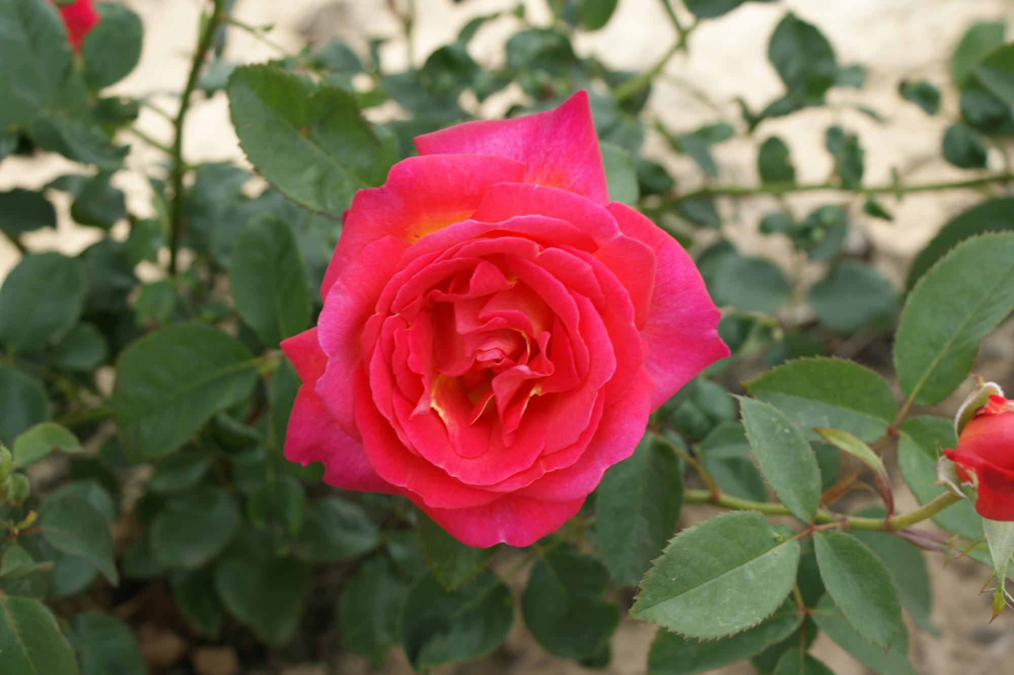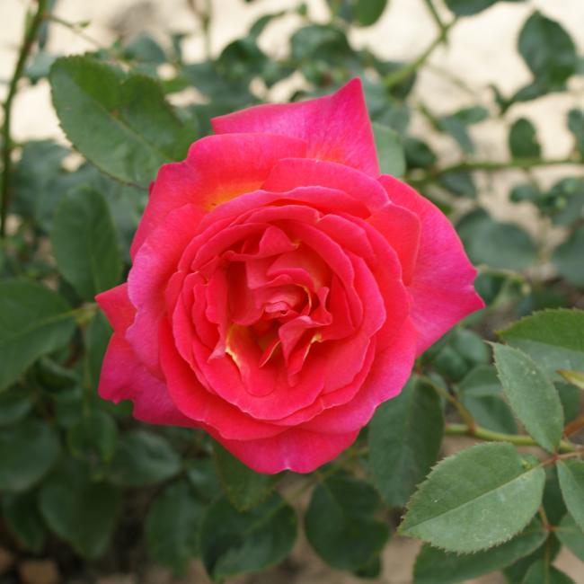 Mooie grote bloemen met een mooie combinatie aan kleuren: roze-rood en cremekleurig. Gezonde roos, goed bestand tegen ziektes. Sterk geurend.